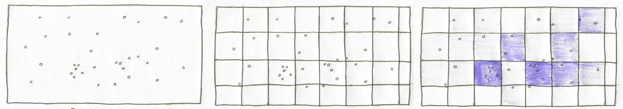 Aggregation is also used along with a technique called binning: given many discrete points, you can draw arbitrary shapes on the map, like squares or hexagons, and total all of the points that fall in each shape. That way, instead of having millions of tiny points that are difficult to grasp at a glance, you can style the map as a choropleth.