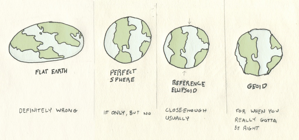 For day-to-day work, we use different estimates of this shape: standards like WGS84 define precise values for the length of both of the Earth’s axes, so we can estimate for a reference ellipsoid rather than a sphere. Local measurements and science that relies on precise surface values can also use geoid models, which are three-dimensional calculations of theoretical ocean heights.