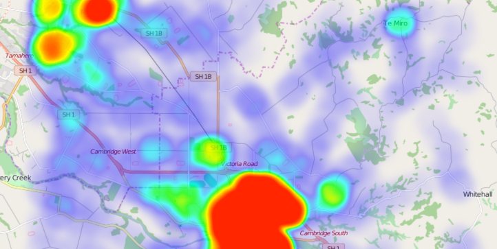 Heatmaps assign each point a weight and represent density of point values in “hotter” colors. This example is from the Leaflet.heat plugin for web maps.