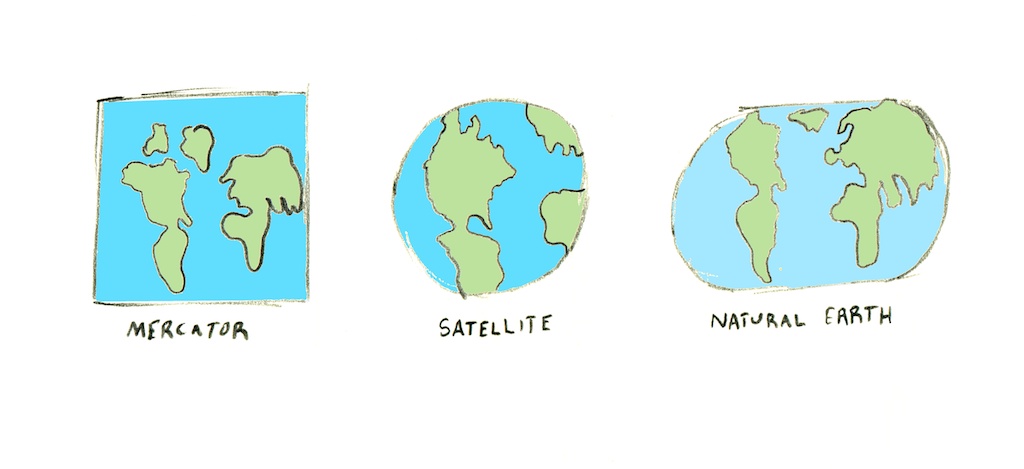 Projections are what we call the mathematical equations that do the trick of turning the world into some flat shape that fits on a printout or a computer screen. It’s a messy task to do, this transformation - there’s no way to smoosh the world onto a screen without distorting it in some way. You either lose direction, or relative size, or come out with something very weird looking.