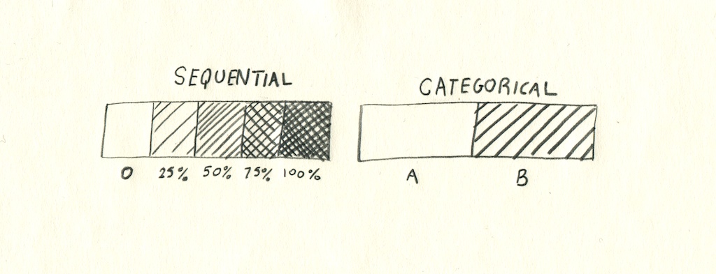 Symbolization tends to highlight two different characteristics of data: sequential and categorical. Sequential, or continuous data could also be called linear - it tends to be number values within a set range, like graduation rates between 0 and 100, or elevation. Categorical, or discrete data is, instead, one of a set number of values - like ‘true’, ‘false’, ‘democrat’ or ‘republican’.